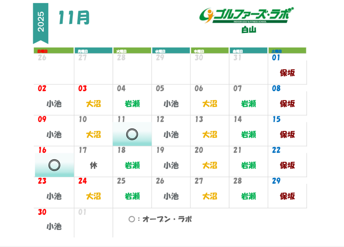 東京都新宿区・文京区ゴルフレッスンのゴルファーズ・ラボ » 11月 白山店レッスンスケジュールのお知らせのページです。新宿区、若松河田で気軽にゴルフレッスン!