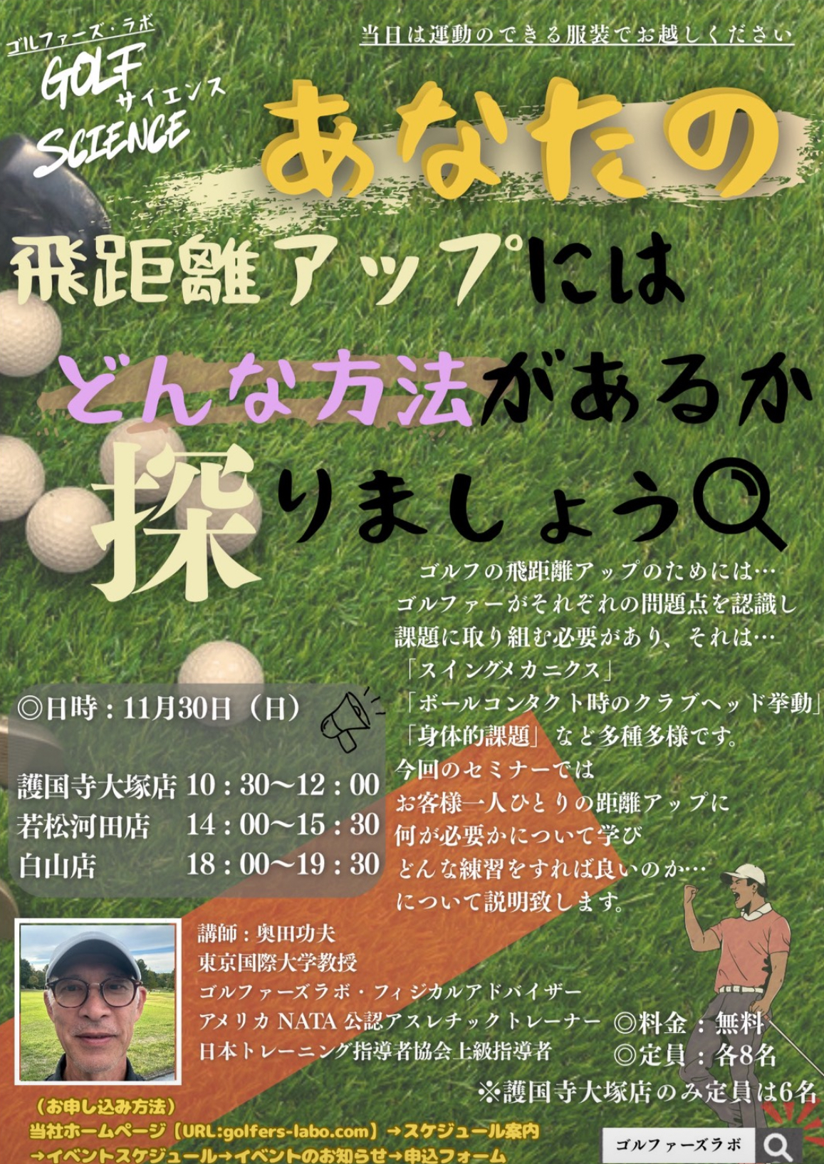 11/30(日)に奥田教授による飛距離アップセミナーを開催いたします。