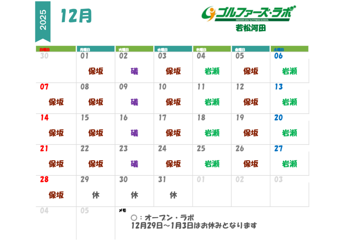 すべてのゴルファーを応援・サポートするゴルファーズ・ラボです。 12月のレッスンスケジュールをお知らせいたします。 12月は12月29日 (月)から1月3日(土)までは年末年始休業となりますのでご周知の程、よろしくお願い申し上げます。 ◎アクセス情報◎ 都営大江戸線「若松河田駅」若松口より徒歩4分 都営大江戸線「牛込柳町駅」西口より徒歩2分。1階が車屋さん