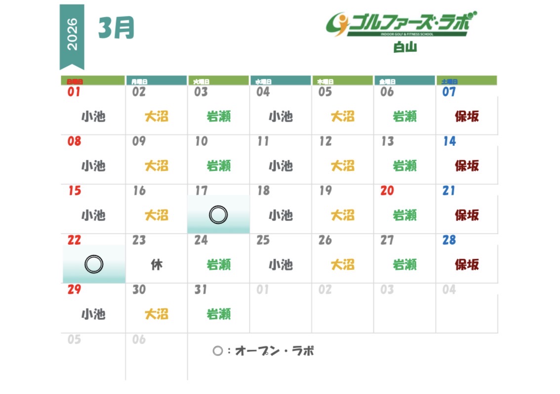 すべてのゴルファーを応援・サポートするゴルファーズ・ラボです。 3月のレッスンスケジュールをお知らせいたします。 3月は3月23日 (月)が休業日となりますのでご周知の程、よろしくお願い申し上げます。 ◎アクセス情報◎ 都営三田線 春日駅乗り換え 白山駅 A1もしくはA2出口すぐ (JR 大塚駅より巣鴨駅 都営三田線乗り換え可)