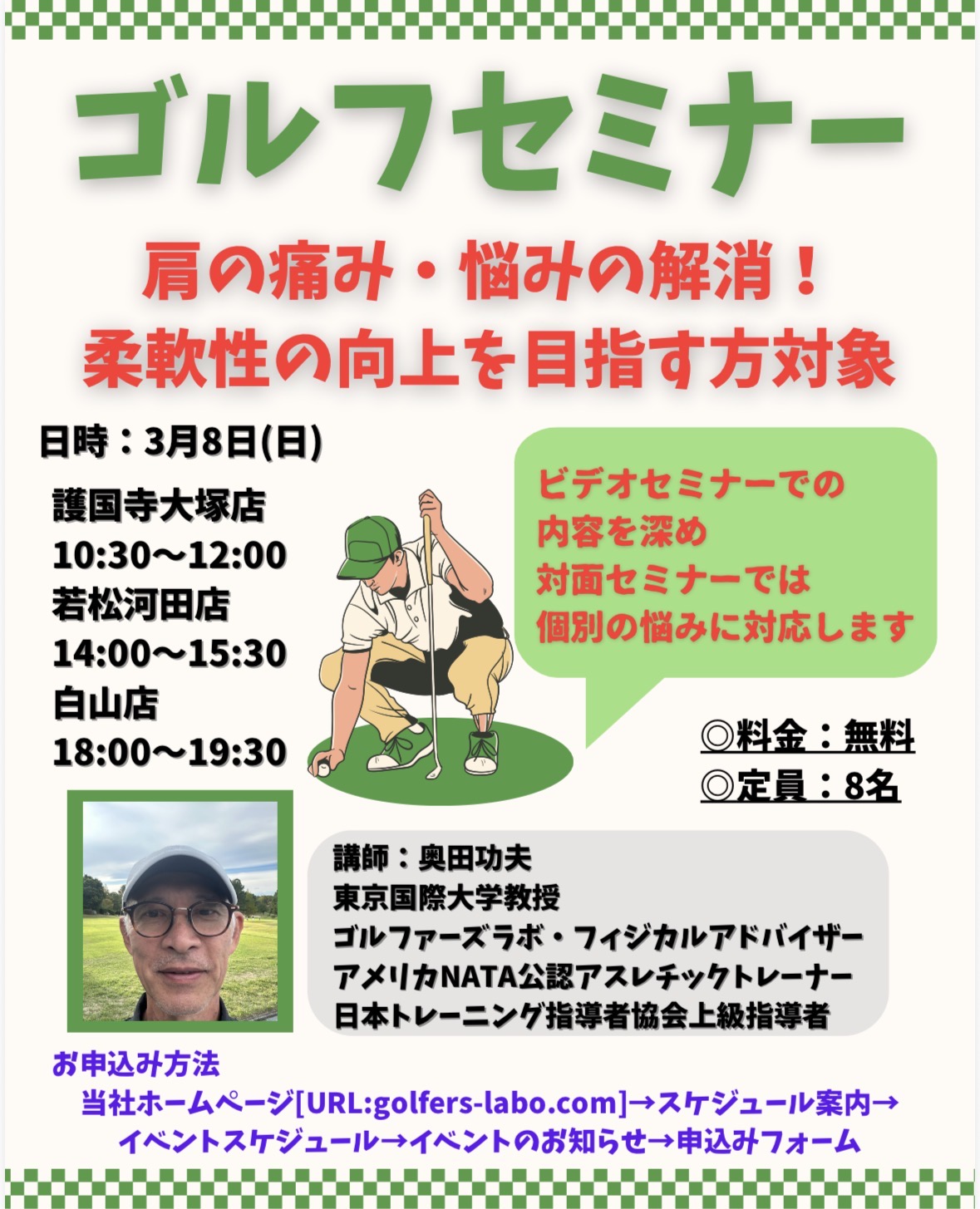 3/8(日)に奥田教授によるゴルフセミナーを開催いたします。