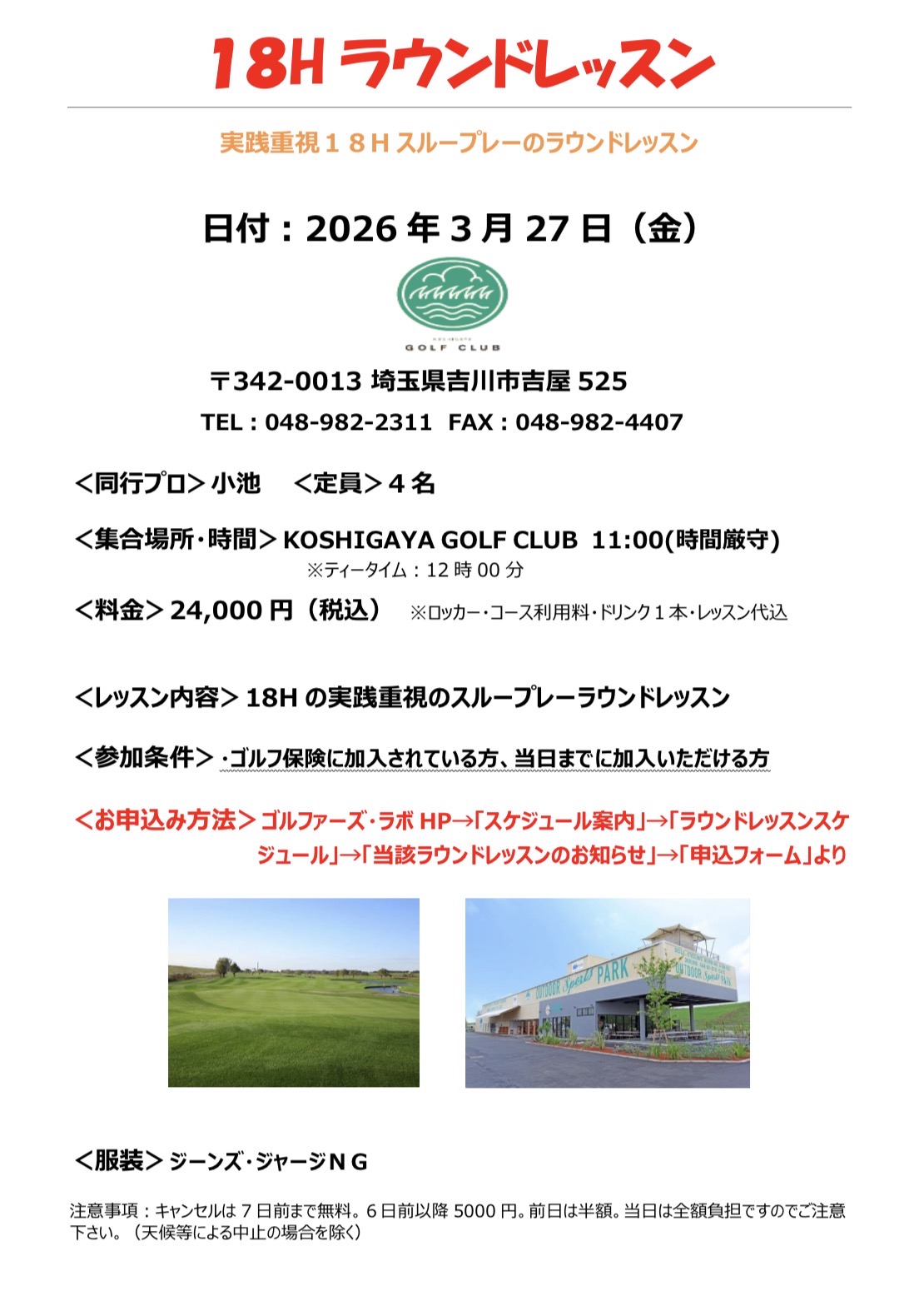 小池プロによる実践重視の18ホールスリープレーのラウンドレッスンとなります。